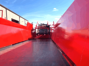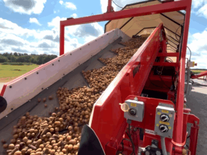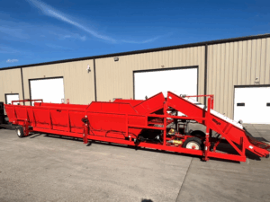 The Mayo Surge Hopper, with high capacity of several hundred cwt., allows trucks to quickly unload and return to the field. The feed conveyor keeps the hopper full and drops to a minimum. The wide, live bottom discharge belt has easily adjustable hydraulic drive to assure even flow. The full swivel steering provides for easy transport and positioning.