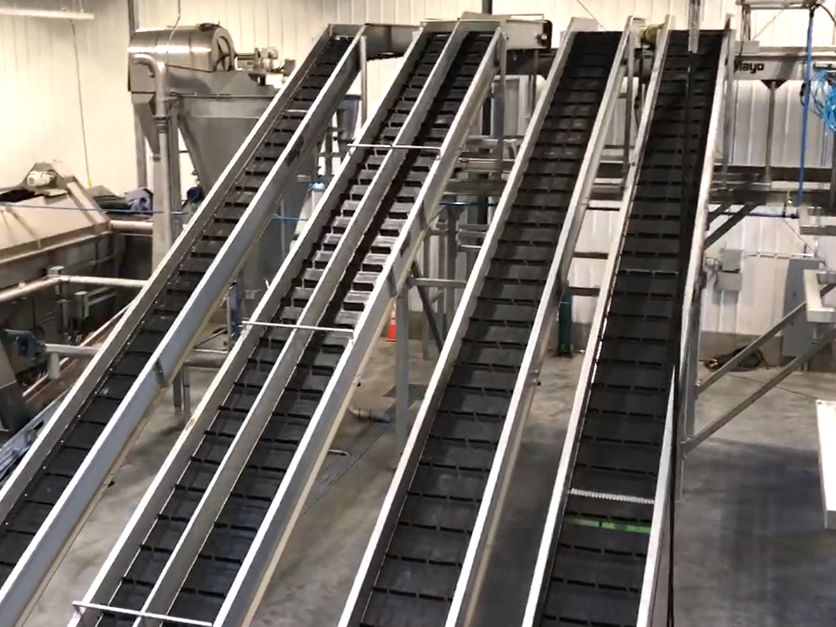 Mayo Elevating Conveyors are designed for each application to reduce roll back and bruise. They are built in a variety of configurations including portable or stationary, cleated belt or chain and the correct cleat pattern.